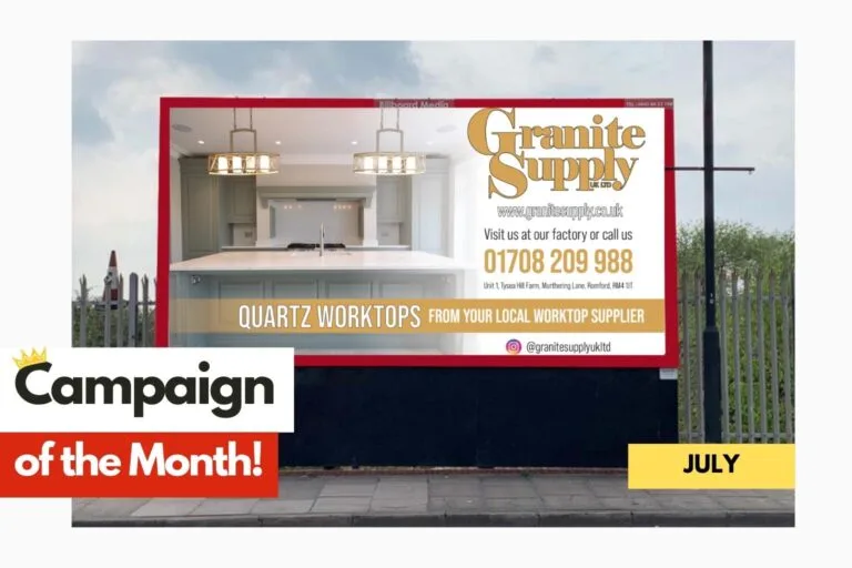 Granite Supply’s billboard stands out with its sleek and luxurious design and a direct call-to-action.